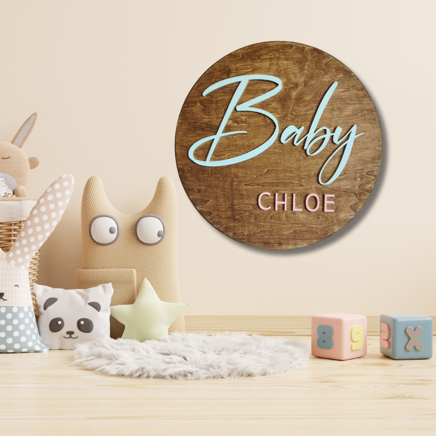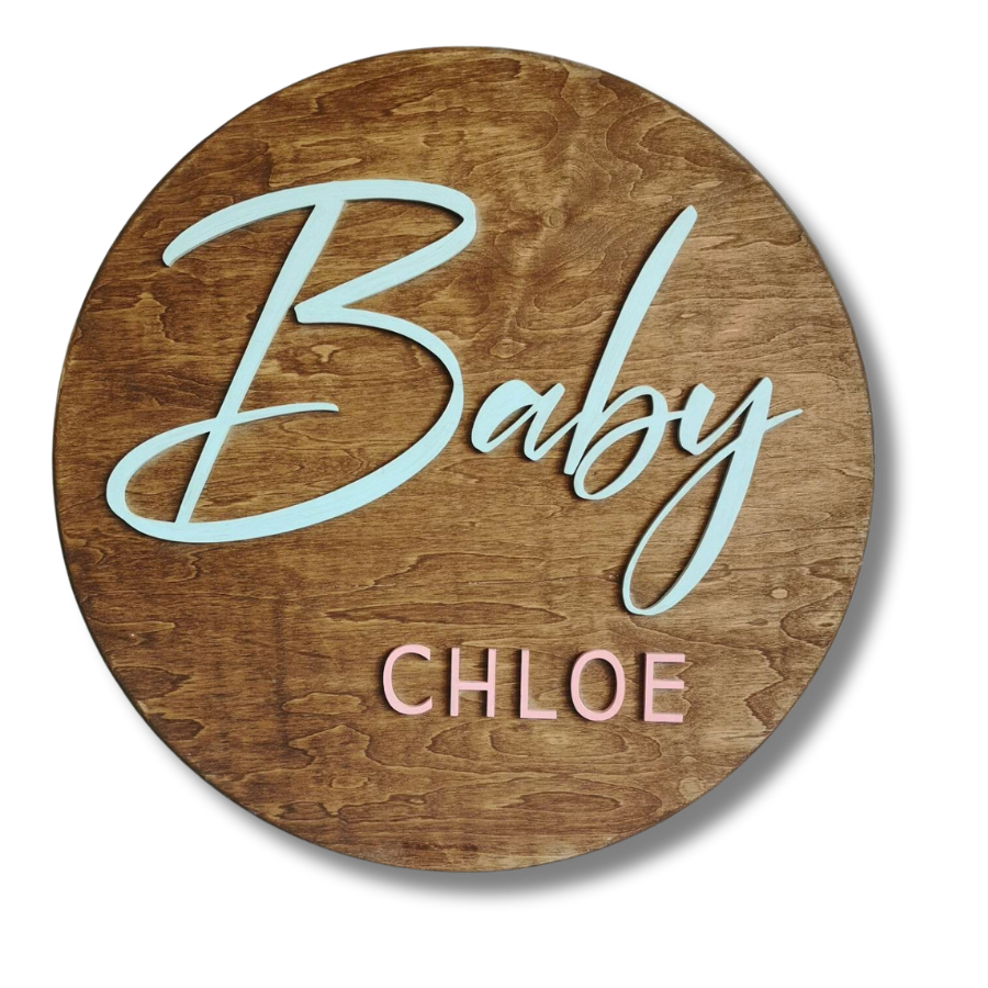 Our 18" Custom Round Baby Name Sign is the perfect way to add a personal touch to your baby's nursery decor! Made from high-quality wood, this sign is a beautiful and unique addition to any nursery. Measuring 18 inches in diameter, it's the perfect size to display on a wall or above a crib.