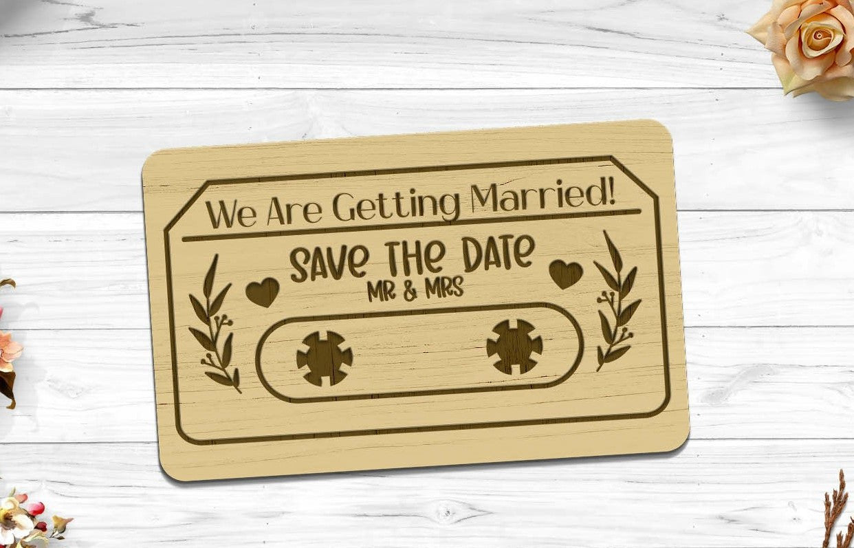 Turn up the nostalgia with this custom wooden "Save the Date" invitation designed as a retro cassette tape! This unique design is perfect for music-loving couples, vintage enthusiasts, or anyone who wants to add a playful, creative touch to their wedding, anniversary party, vow renewal, or even a themed birthday bash. It’s not just an invitation—it’s a conversation starter and a keepsake that guests will treasure. Personalize it with your names and event date to make it truly your own. Whether you're planning a funky 80s-inspired celebration or simply want to stand out, this wooden invite brings personality and flair to your special day.