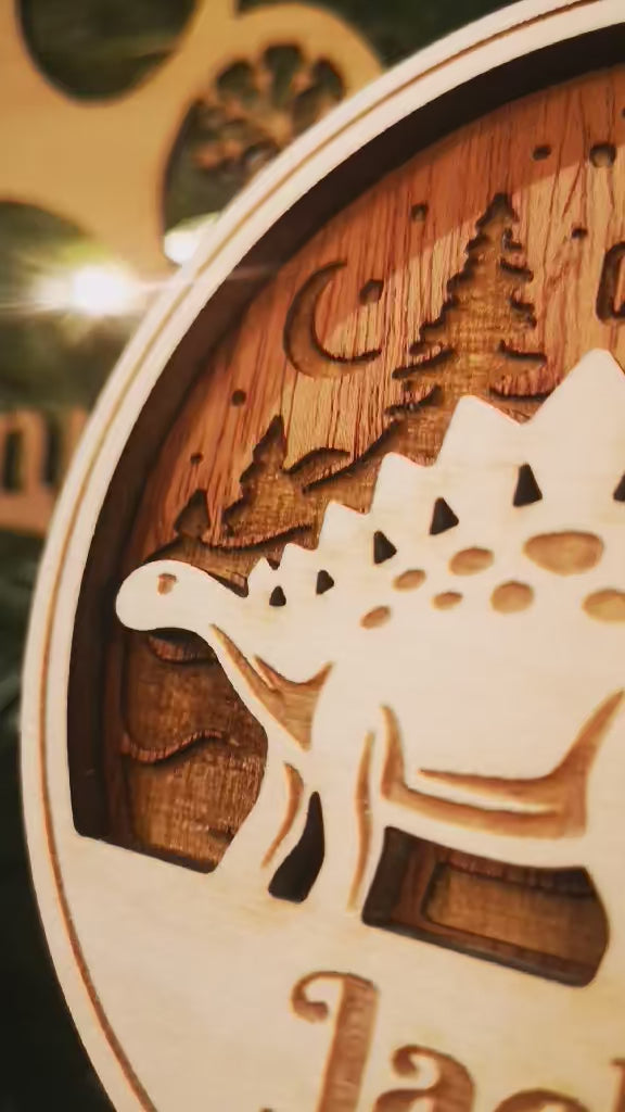 Personalized Dinosaur-Themed Family Christmas Ornament – Handcrafted from Canadian Maple | Custom Name Engraving